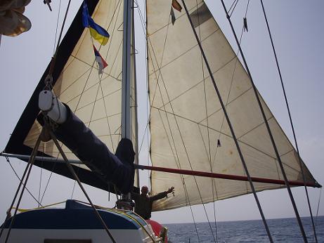 Часто налетал ветер и мотал яхту из стороны в сторону на якорной цепи. В воздухе висела пыль, и оседала толстым слоем на крыше каюты. Иногда заходили яхты на несколько дней. И уходили дальше по своему пути. Как-то утром, открыв люк, увидел большую парусную шхуну, бросившую якорь на рейде порта. Достал бинокль. Прочел название. Судно называлось «Летучий Голландец». На корме гордо развивался большой голландский флаг. На надувной лодке подплыл к ним. Капитан судна голландец. Он был слегка пьян. Команда тоже была пьяна .Они шли в Голландию, Амстердам. Им предстоял долгий, на сотни морских миль, путь против ветра и волн.